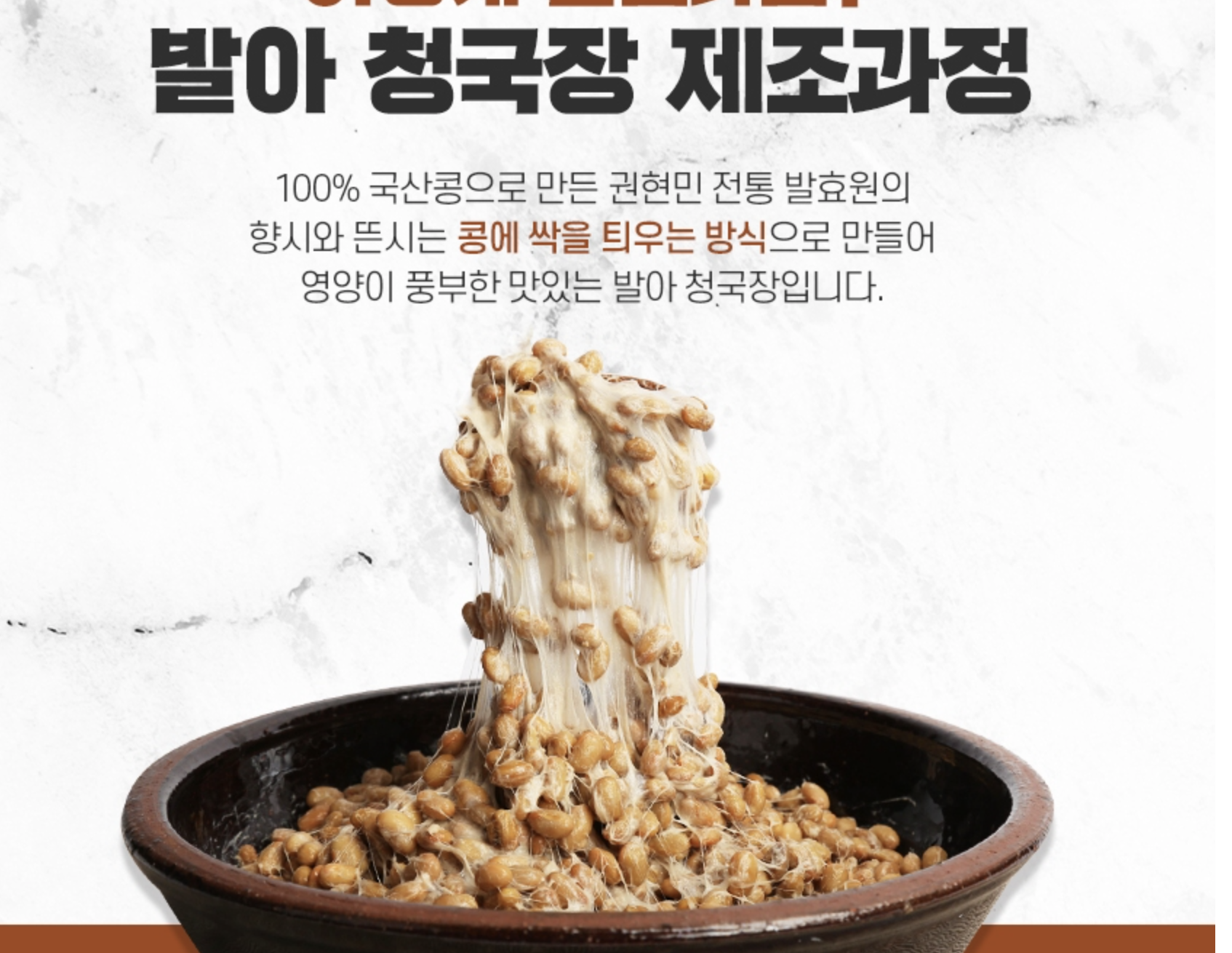 기존의 푹 익은 청국장과 달리, 잡내가 적고 담백한 맛이 특징입니다.