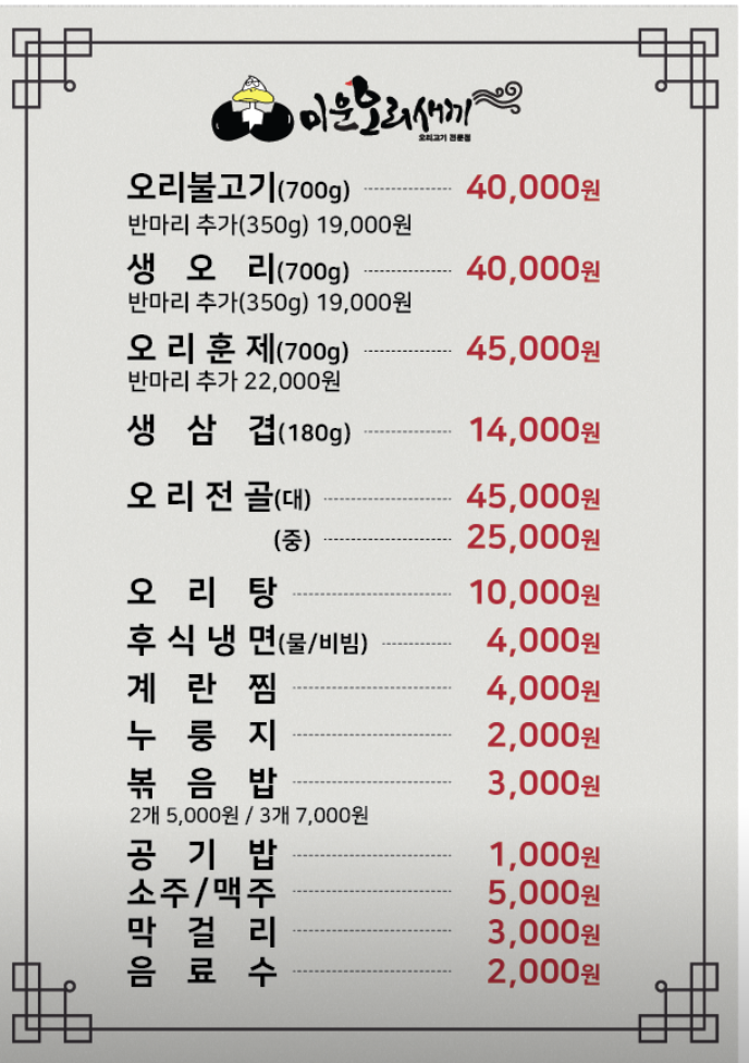 | 생오리 (700g) | 40,000원 | 신선한 생오리를 직접 구워 먹는 메뉴 |