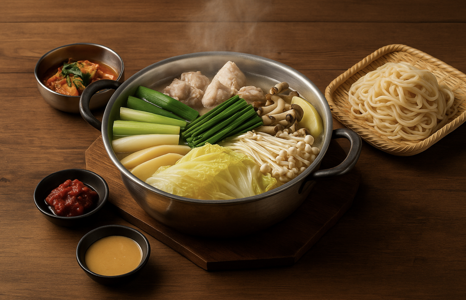 채소, 버섯, 배추김치, 소스, 칼국수, 죽이 세트로 나와요.