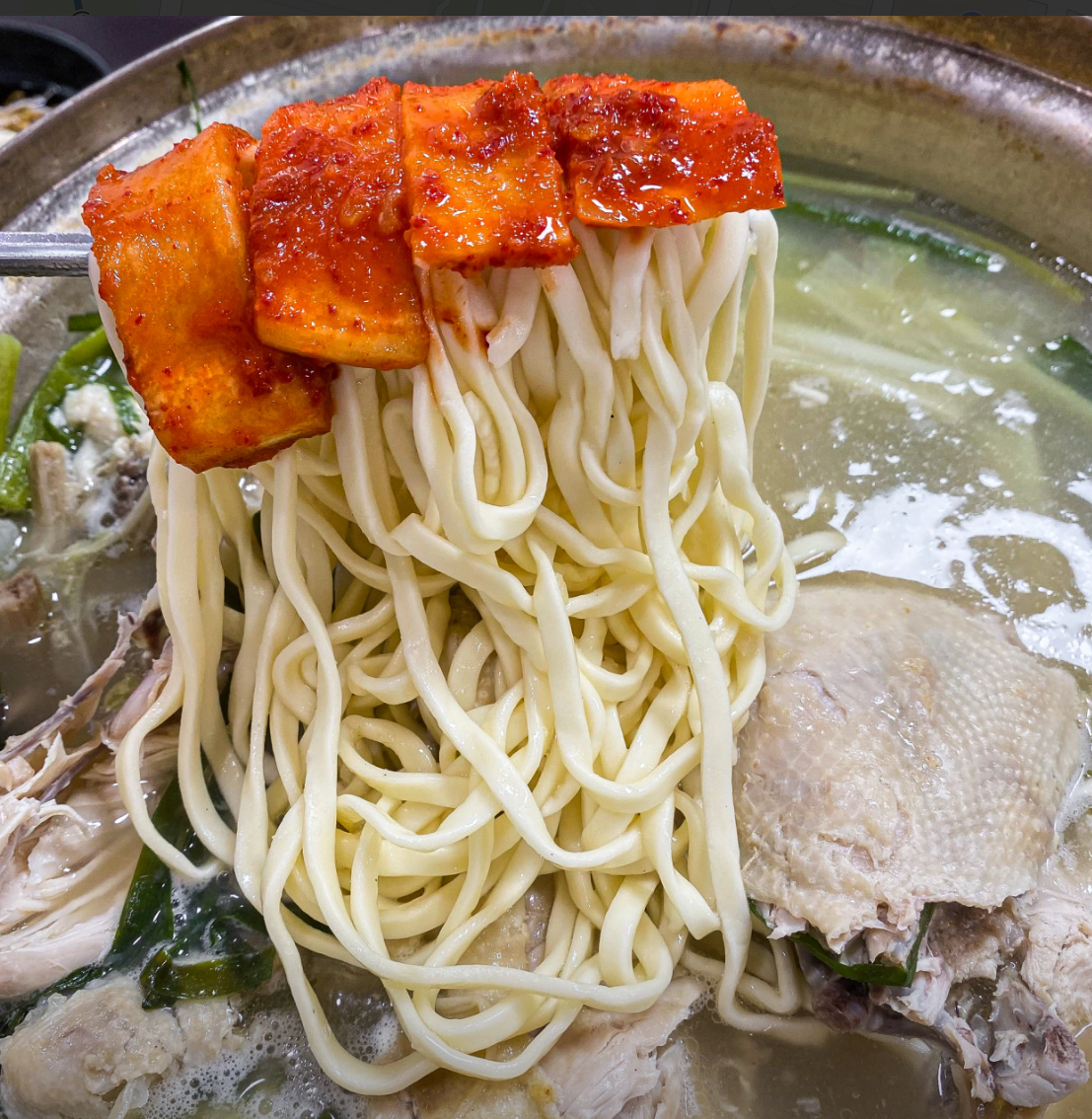 닭을 삶을 때 기름을 걷지 않고 자연 숙성시켜, 더 진하면서도 담백한 국물 맛이 나온다고 하네요.