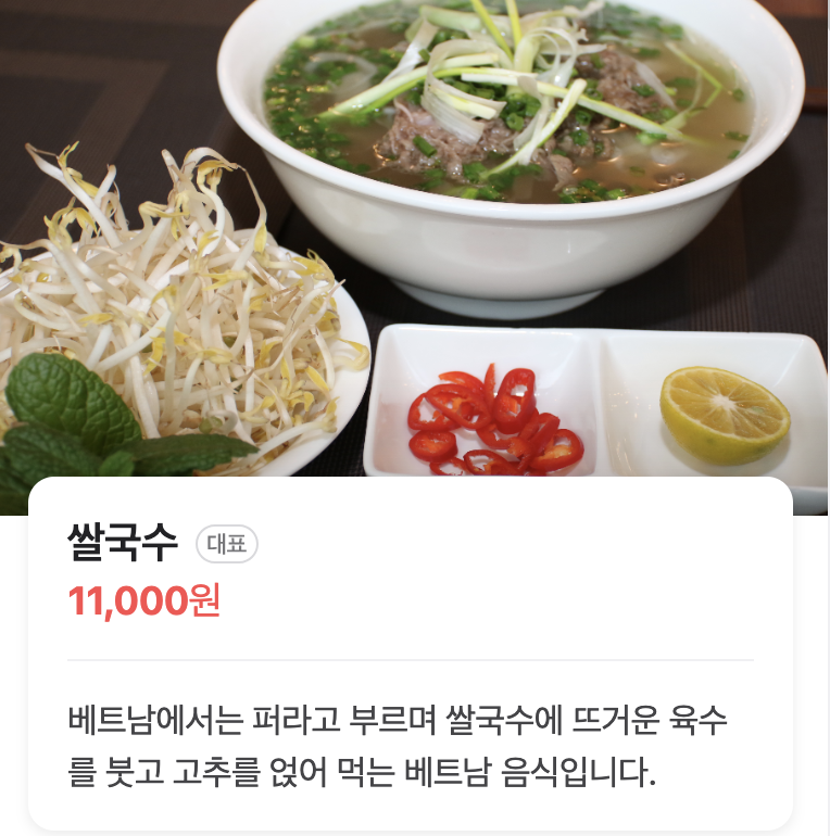 | 반미 | 6,000원 | 바삭한 바게트 속 부드러운 고기 |