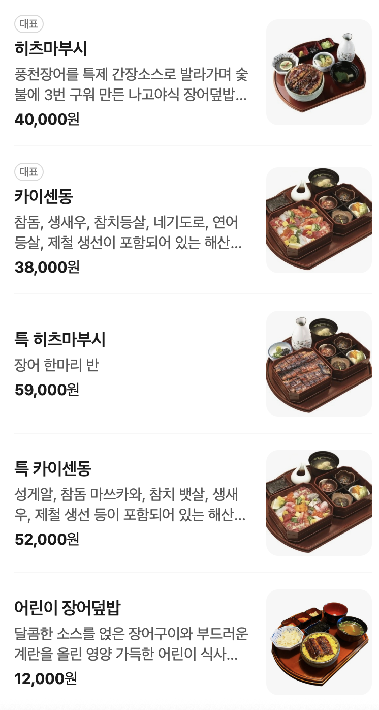 | 특 히츠마부시 | 장어 1.5마리 분량의 프리미엄 구성 | 59,000원 |